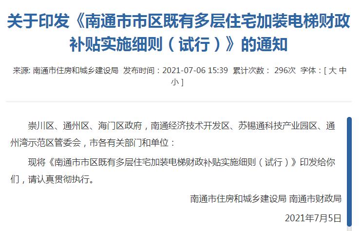 日前,南通市住建局和財(cái)政局聯(lián)合出臺了《南通市市區(qū)既有多層住宅加裝電梯財(cái)政補(bǔ)貼實(shí)施細(xì)則(試行)》,按照規(guī)定海門區(qū)也從8月15日起施行。 按照《實(shí)施辦法》,加裝電梯且樓層數(shù)達(dá)四層及以上的,經(jīng)申請予以電梯所