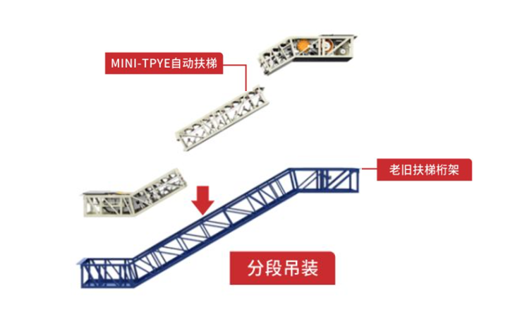 產(chǎn)品采用極窄桁架寬度設(shè)計(jì),分段出廠,現(xiàn)場(chǎng)對(duì)接組裝,完美解決舊梯無(wú)法整體拆除和新扶梯進(jìn)場(chǎng)難的問(wèn)題。在施工過(guò)程中,不會(huì)影響商場(chǎng)、樓宇正常營(yíng)業(yè),縮短工程周期。