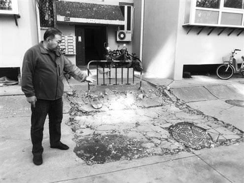 9月23日,是老樓加裝電梯的第一天,施工隊(duì)已經(jīng)入駐了進(jìn)來。他們?cè)趩卧T前砸出了一個(gè)四四方方的坑,水泥地立刻“四分五裂”,正要繼續(xù)時(shí),一樓業(yè)主突然跑來,站在塌陷中央,阻止施工隊(duì)繼續(xù)施工?!八f,她不同意在這里安裝電梯,為此,施工隊(duì)只好停下,勸業(yè)主們先自行協(xié)調(diào)。”