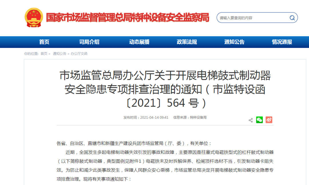 為切實(shí)落實(shí)電梯安全主體責(zé)任,提高電梯維保質(zhì)量和安全水平,預(yù)防和減少電梯事故發(fā)生,保障人民群眾安心乘梯。市場監(jiān)管總局近日發(fā)布通知,要求在全國范圍內(nèi)開展電梯鼓式制動(dòng)器安全隱患專項(xiàng)排查治理。此次專項(xiàng)排查治理是2021年總局“安心乘梯守護(hù)行動(dòng)”重要舉措之一,也是落實(shí)總局黨組黨史學(xué)習(xí)教育“我為群眾辦實(shí)事”的具體表現(xiàn)。
