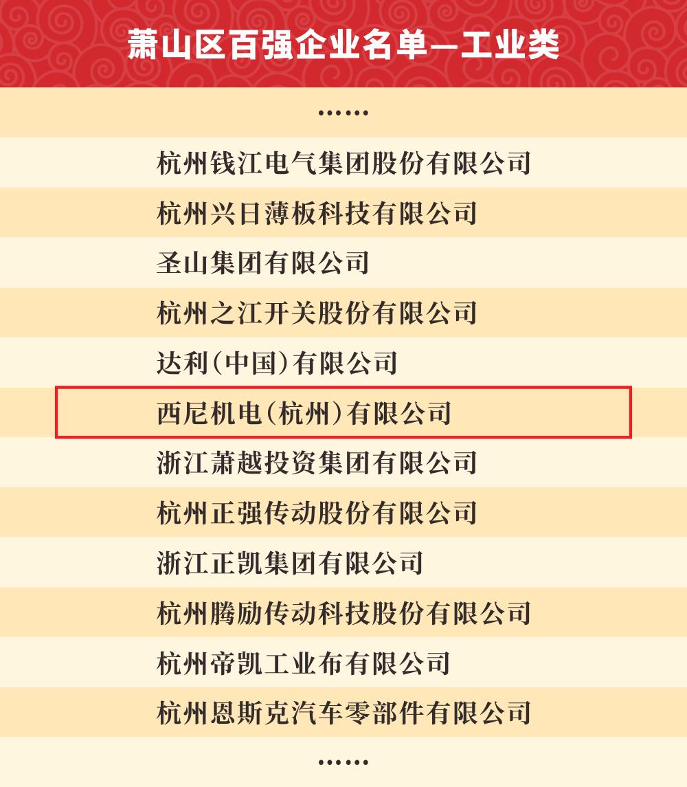 西尼機(jī)電多次入選“蕭山區(qū)百?gòu)?qiáng)企業(yè)”榜單。這一榜單是對(duì)我司綜合實(shí)力的展現(xiàn),也是對(duì)西尼發(fā)展的充分肯定和鼓勵(lì)。在未來(lái),西尼仍將堅(jiān)持走高科技、高技術(shù)、創(chuàng)新化、高品質(zhì)的國(guó)際化發(fā)展道路,不忘初心,砥礪前行,實(shí)現(xiàn)更高的經(jīng)濟(jì)價(jià)值和社會(huì)價(jià)值。