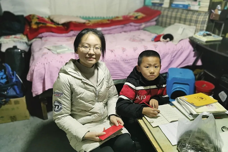 走訪的第一戶學生,小雪同學父親在2014年因病去世,家里剩下媽媽和弟弟,一家三口在不足10平米的房間里起居生活。我們到的時候,弟弟正彎著身子趴在飯桌上一筆一劃地練字。輕松交談間,姐弟倆肖似的相貌在金黃昏暗的燈光映襯下格外溫柔